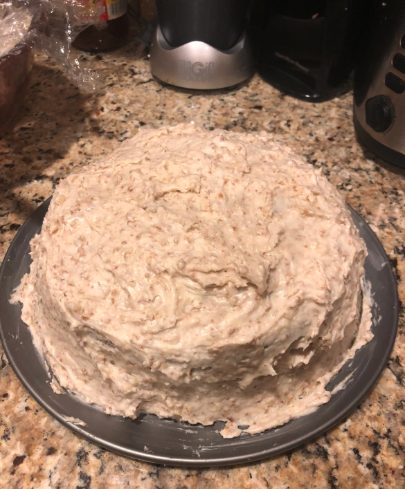 Frosting: 2 cream cheese (8oz), 1 stick unsalted butter, 2 (1lb) box of confectioners sugar, 2 tsp pure vanilla extract, 2 cups chopped pecans.