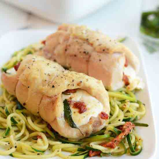 Recipe Name: Caprese Stuffed Chicken Breast with Garlic Zoodle Pasta