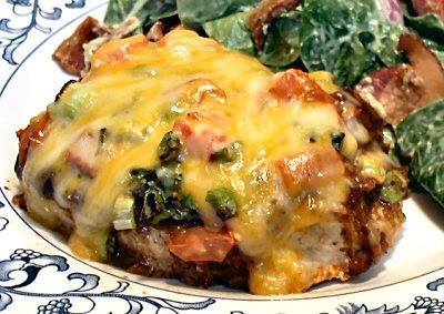Line a large rimmed baking sheet with foil and spray with cooking spray. Season the chicken on both sides with the taco seasoning and place on the baking sheet. Top each with 2 tablespoons of the enchilada sauce, some of the tomato and green onions. Bake at 400º for 20 minutes; sprinkle with the cheese and bake about 4 more minutes to melt the cheese.