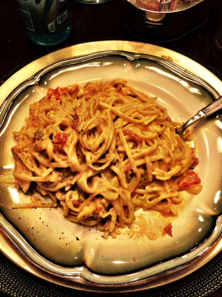 5 Add tomatoes, soup, cooked chicken (cut into bite-size pieces) and spaghetti to the sautéed onion mixture, one at a time, and gently mix together.