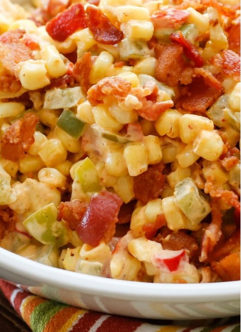 Cook the bacon over medium high heat, stirring frequently to separate, about 4-5 minutes. Remove to a paper towel lined dish. Drain off most of the grease, leaving a light coating on the pan. Add the bell peppers to the hot skillet and saute over medium high heat for about a minute. Add the corn and cook for an additional 5 minutes or so, until the corn is hot.
