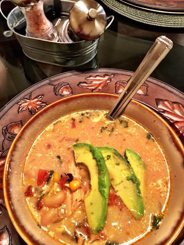 Spoon out and garnish with sliced avocado, chopped cilantro and shredded Monterrey Jack cheese. Salt and pepper to taste