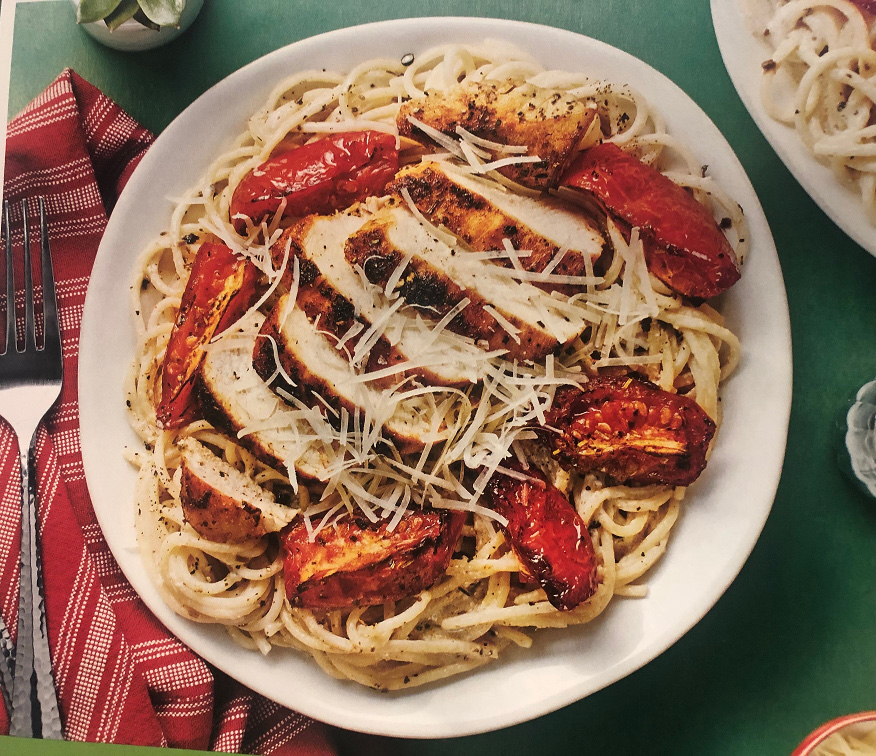 14) Divide pasta between bowls. Top with chicken and roasted tomatoes. Sprinkle with remaining parmesan cheese.
